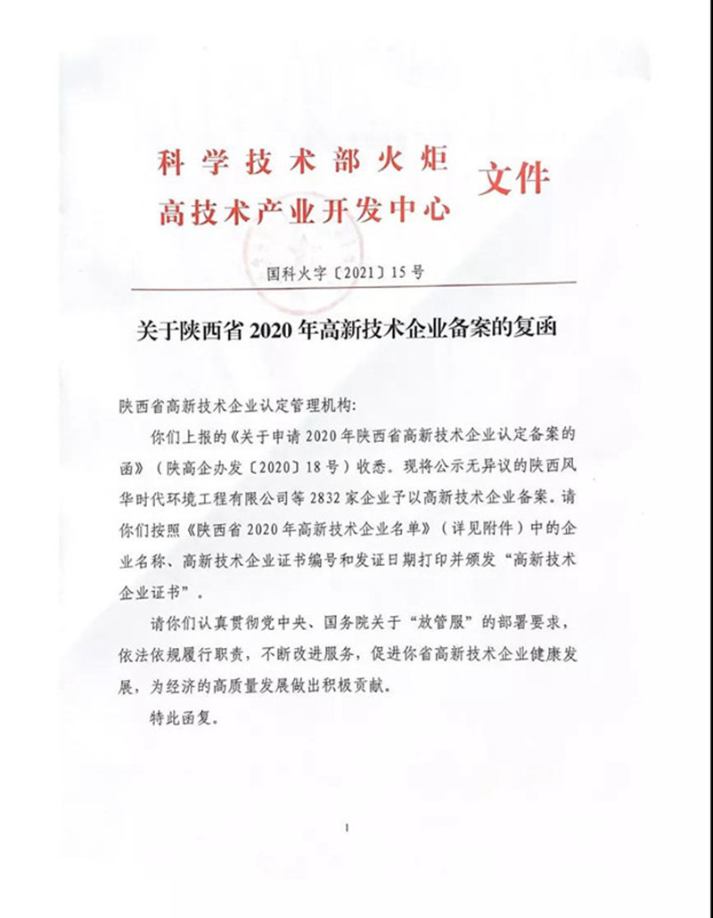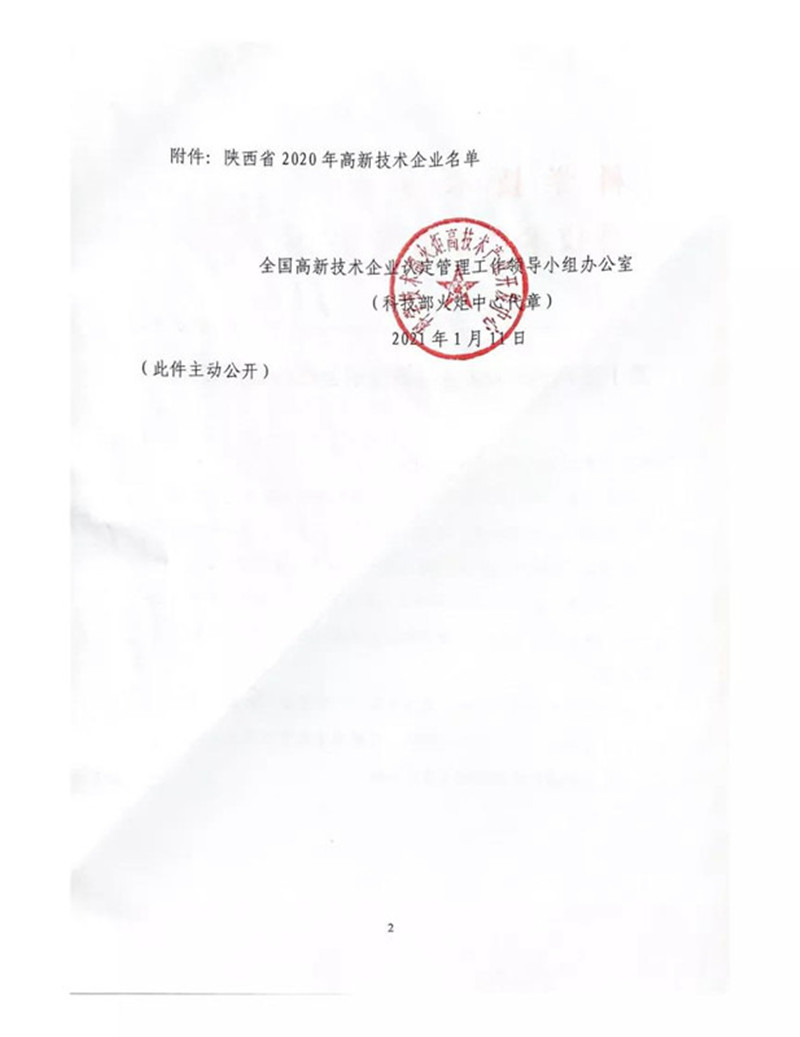 近日,全国高新技术企业认定管理工作领导小组办公室发布《关于陕西省2020年高新技术企业备案的复函》(国科火字【2021】15号)文件,公示了陕西省2020年高新技术企业认定名单。