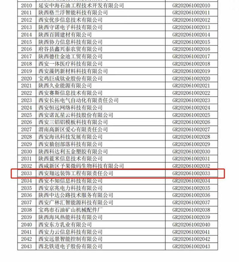其中,西安翔远装饰工程有限责任公司通过认定,获得“ 全国性高新技术企业”荣誉称号!