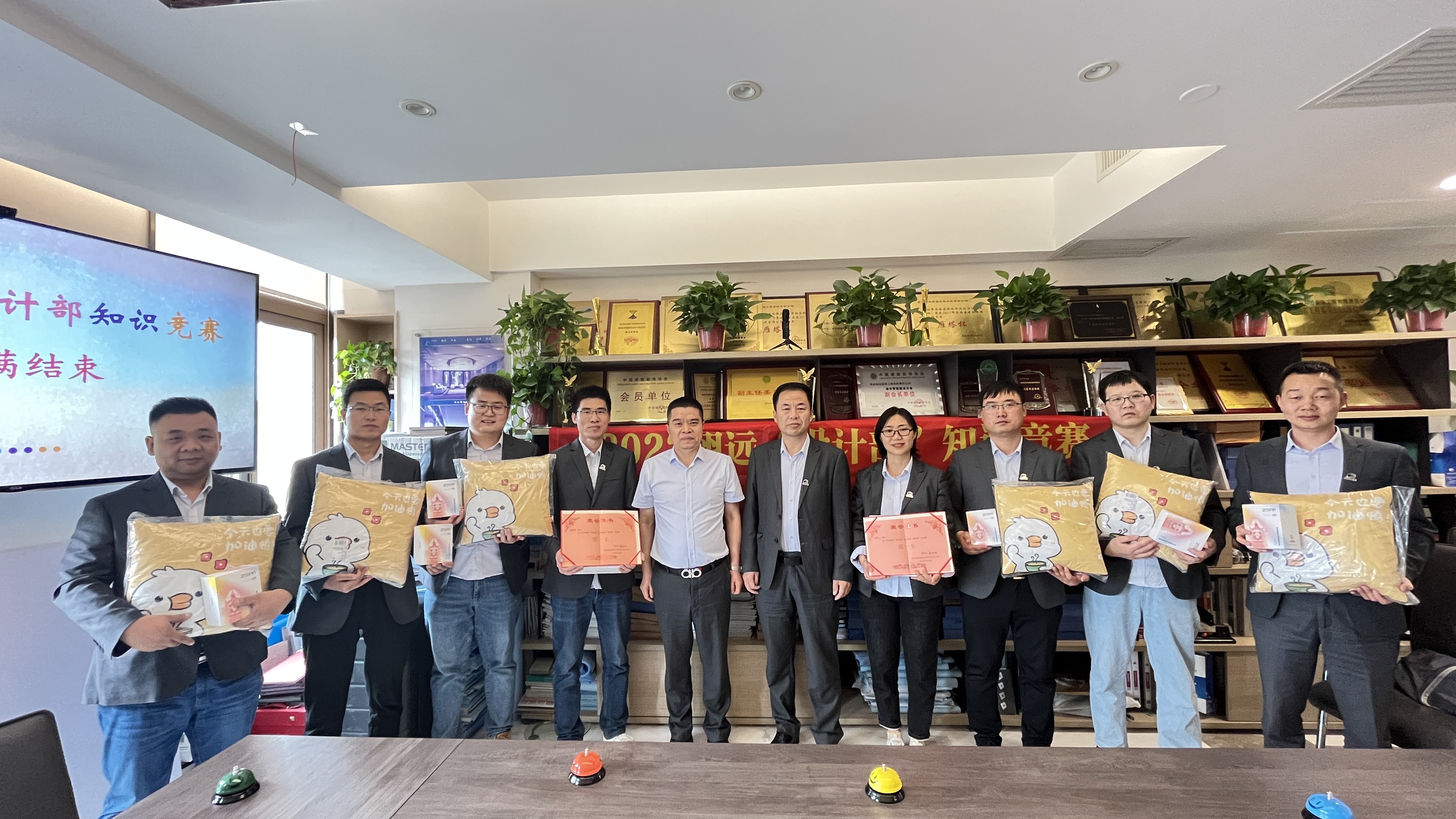 在一阵激烈的角逐过后,两场比赛的第一名都脱颖而出,内装设计刘青利和外装设计部师小明分别获得第一名,由董总为第一名颁发奖品和证书;梁总和郑总分别为内外装设计部其余参赛人员颁发参与奖;至此,我们的比赛在精彩竞答和欢声笑语中圆满落幕。