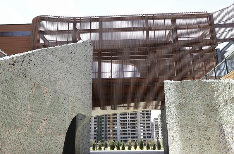 内墙贴面是由色彩浑然,风格古朴的陶板、陶棍、陶砖依次排列装饰,尽显陶文化古城的魅力。充分体现“十里窑场”耀州古韵。