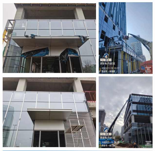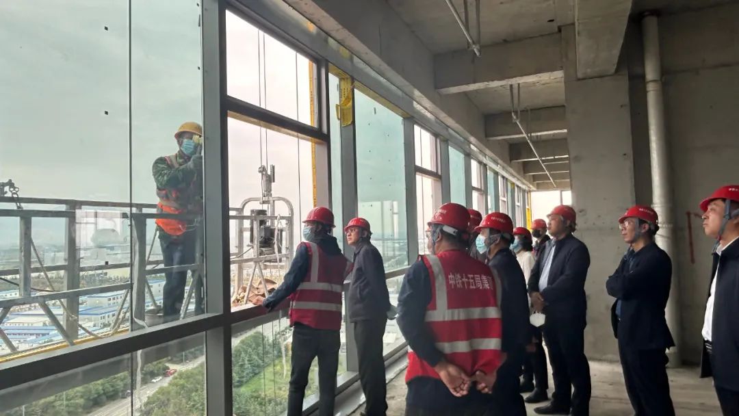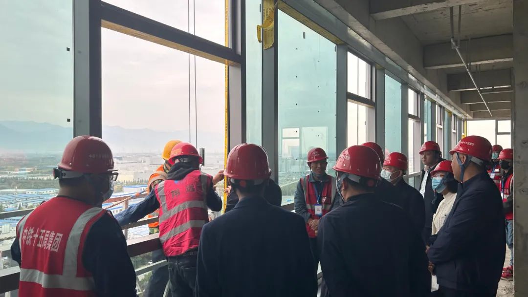 中铁集团总公司相关领导一行对我们参建的电子谷幕墙项目进行视察,视察过程中,主要对单元板块幕墙进行了从原材料采购、加工厂加工、到材料安装等一系列的流程进行现场详细交流。在交流过程中,对我们玻璃幕墙整体效果、细部节点处理、铝板成品加工质量等方面做出充分肯定及表扬,称赞我们现场管理人员在幕墙施工工艺方面有极高的专业度,并号召其他幕墙单位以我们为标杆,学习及交流。