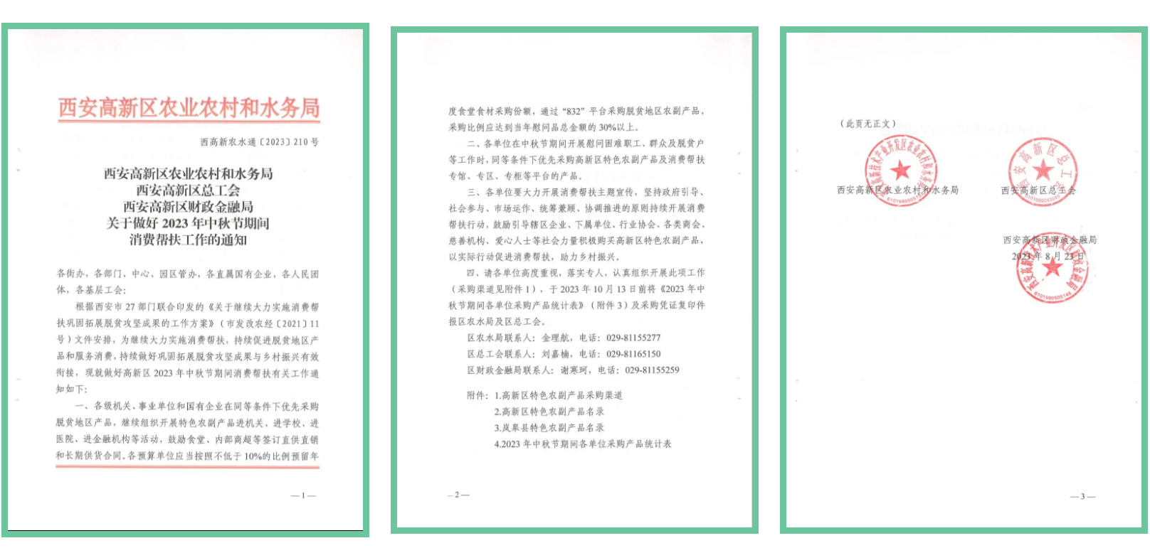 2023年8月23日,西安高新区农业农村和水务局、西安高新区总工会、西安高新区财政金融局发布关于做好2023年中秋节期间消费帮扶工作的通知。鼓励各单位、各企业在同等条件下优先采购脱贫地区产品,组织开展特色农副产品进机关、进医院、进各大机构等活动。要求各单位大力开展。消费帮扶主题宣传。