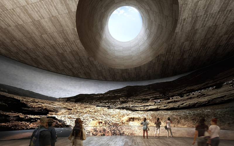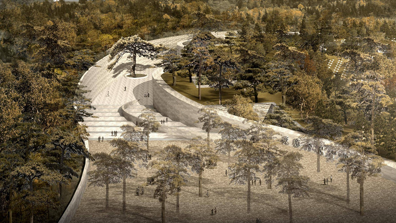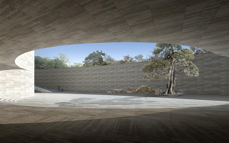 黄帝文化中心总平面由地面广场、下沉式入口广场、文化中心地区全地下建筑主体、地面绿化、内部专用通道和专用停车场共同组成。内部功能分区为陈列区、公共服务区、办公区、藏品库区。陈列区由序厅、轩辕传奇展厅、黄帝美术馆展厅、非物质文化遗产展示中心和临时陈列展厅共同组成。序厅平面 为椭圆形,是黄帝文化中心室内空间的核心区,也是游客进入文化中心的第 一景观。各陈列厅沿中央大厅周边布置,共同组成黄帝文化中心内部空间。