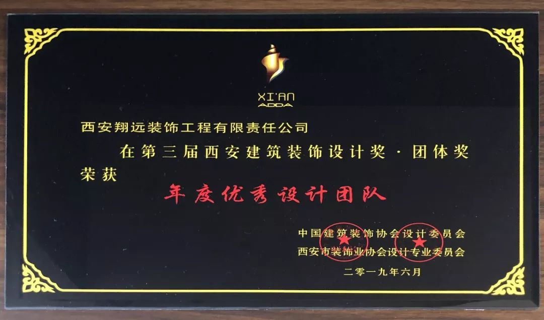 西安翔远装饰工程有限责任公司荣获第三届西安建筑装饰设计奖·团体奖--“年度优秀设计团队”。