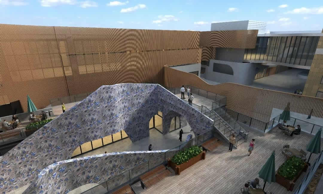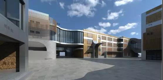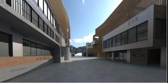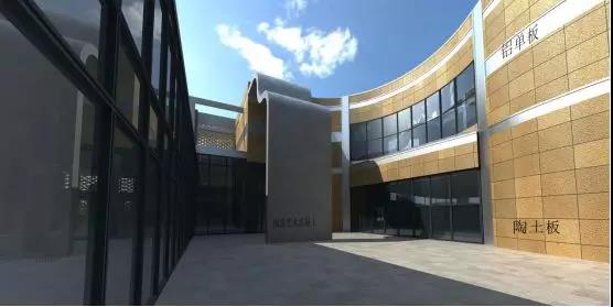 陶土板幕墙主要分布于博物馆的十字内街、内庭院等位置。陶土板采用20mm厚定制陶土板,完成面距主体结构250mm,陶土板总共设计为三种机理,陶土板通过铝盒装饰条来划分进行区域的划分。