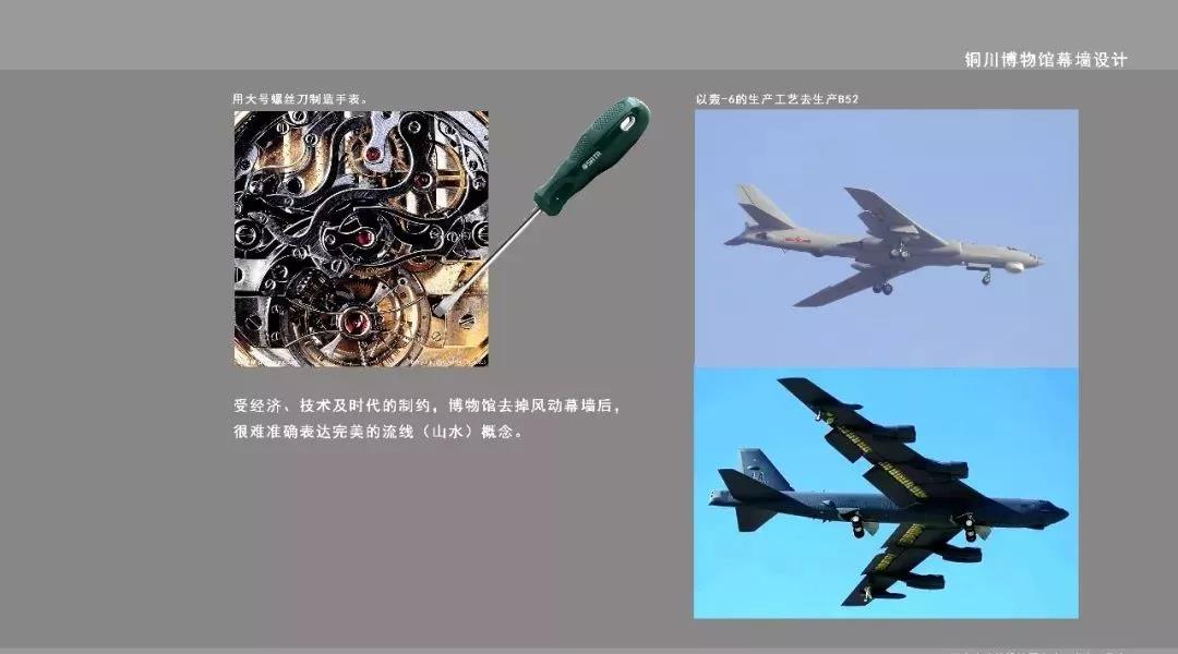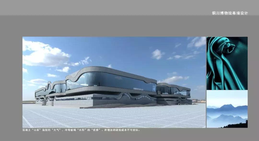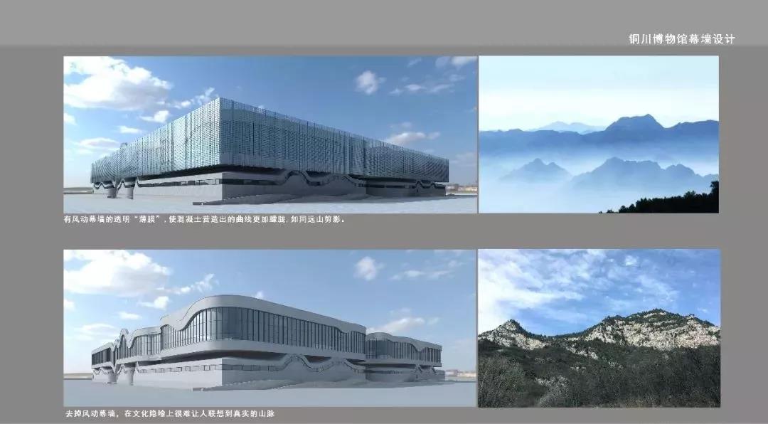 通过可以在空中随风飘舞的风动幕墙形成水波效果,与起伏连绵山的建筑构造相结合,形成山水呼应、若隐若现的山水景象,也寓意着铜川沧海桑田的变化和发展景象,使得新技术、新工艺的现代幕墙与博物馆建筑从历史文脉及建筑形体上结合的更加紧密自然。
