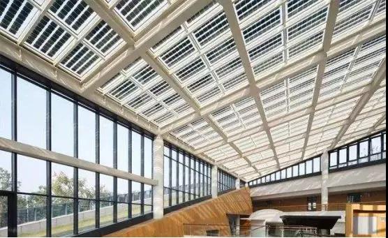 六区采光顶与光伏的进一步结合是将光伏器件与建筑材料集成化。用光伏器件代替玻璃采光顶,即用光伏组件来做建筑物的屋顶,这样既可用做建材也可用以发电,可谓物尽其美。整个围护结构做成光伏阵列,选择的光伏组件,既可吸收太阳直射光,也可吸收太阳反射光。大尺度的彩色光伏模块,使建筑外观更具魅力。