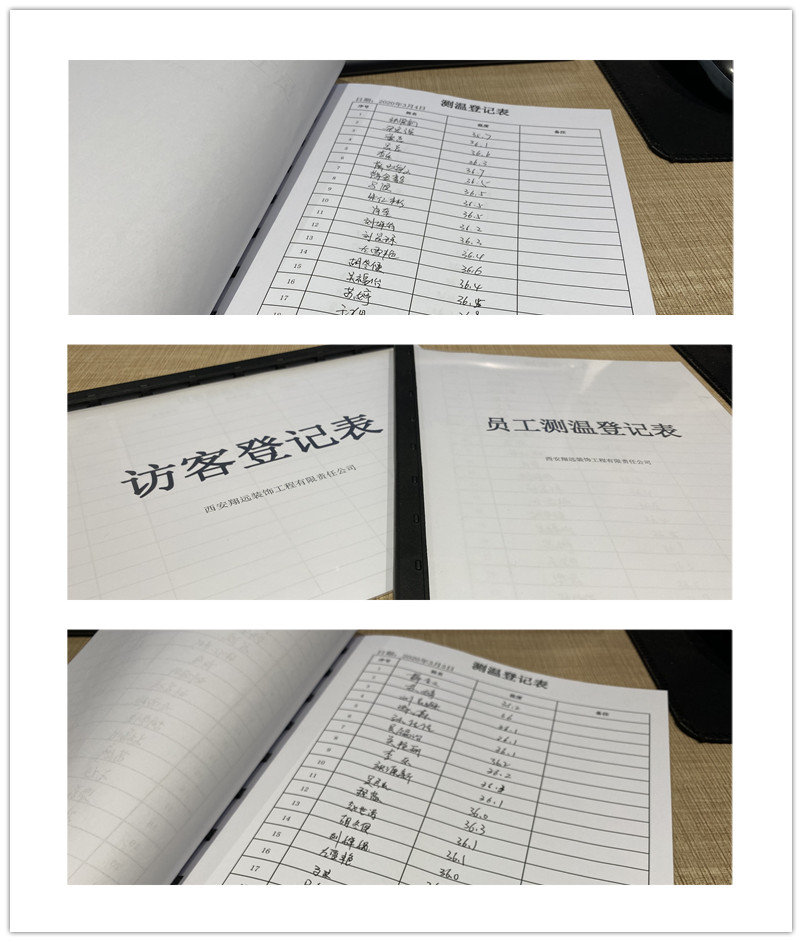 每天值班人员,对每位员工上下班进行体温检测,酒精清洁,并登记在册,公司访客也会严格登记身份证、联系方式、路程轨迹等详细信息。