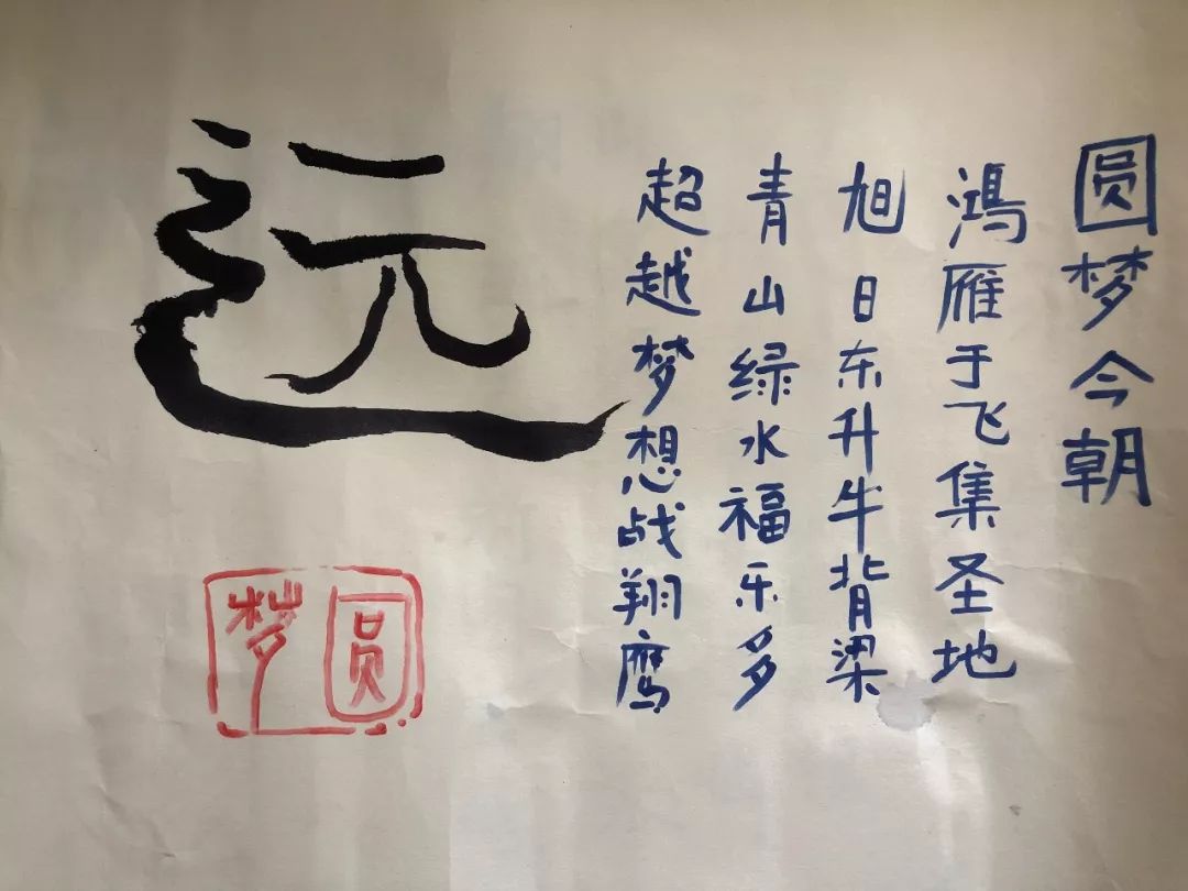直径1.5m圈外,每人一根绳子,用清水在地面上练习。在团队比拼时,要求合力在教练派发的白纸上完成“翔”和“远”,并以此字为主题,结合团队成员每个人的名字完成一首七言绝句,综合表现得分高的队伍获胜。